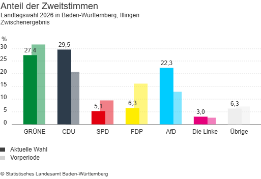 Bei den Zweitstimmen liegt ebenfalls die CDU vorne mit 1.181 Stimmen (29,5 Prozent). Es folgen die Grünen mit 1.094 Stimmen (27,4 Prozent) und die AfD mit 894 Stimmen (22,4 Prozent). Dahinter liegen FDP mit 253 Stimmen (6,3 Prozent), SPD mit 205 Stimmen (5,1 Prozent) und Die Linke mit 120 Stimmen (3,0 Prozent).