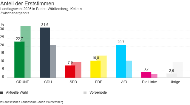Keltern. Bei der Landtagswahl in Baden-Württemberg am 8. März 2026 hat in der Gemeinde Keltern bei den Erststimmen der CDU-Kandidat Nico Gunzelmann das beste Ergebnis erzielt. Er erhielt 1.656 Stimmen, was einem Anteil von 31,6 Prozent entspricht. Auf Platz zwei folgt Stefanie Seemann von den Grünen mit 1.188 Stimmen (22,7 Prozent). Dahinter liegt Alexander Steblau von der AfD, der 1.081 Stimmen und damit 20,7 Prozent der Erststimmen erreichte.