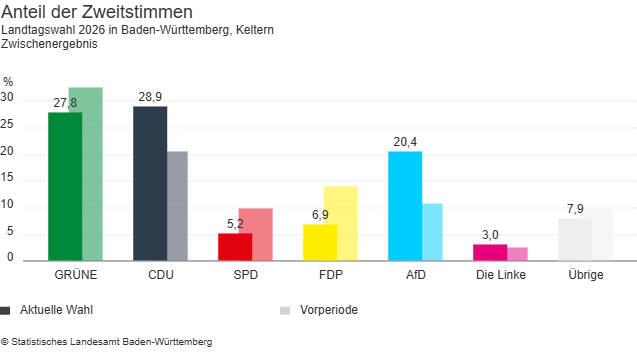 Bei den Zweitstimmen liegt in Keltern die CDU ebenfalls vorne. Sie erhielt 1.518 Stimmen und damit 28,9 Prozent. Dahinter folgen die Grünen mit 1.458 Stimmen (27,8 Prozent). Die AfD kam auf 1.073 Stimmen (20,4 Prozent). Für die FDP wurden 361 Stimmen (6,9 Prozent) gezählt. Die SPD erhielt 273 Stimmen (5,2 Prozent), während Die Linke auf 157 Stimmen beziehungsweise 3,0 Prozent kam.