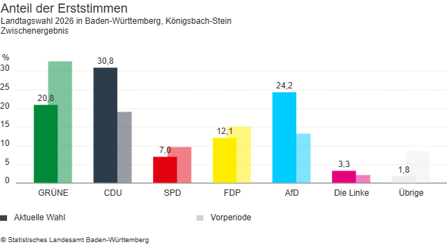 Königsbach-Stein. Bei der Landtagswahl in Baden-Württemberg am 8. März 2026 hat in der Gemeinde Königsbach-Stein bei den Erststimmen der CDU-Kandidat Nico Gunzelmann das beste Ergebnis erzielt. Er erhielt 1.712 Stimmen, was einem Anteil von 30,8 Prozent entspricht. Auf Platz zwei folgt Alexander Steblau von der AfD mit 1.347 Stimmen (24,2 Prozent). Dahinter liegt Stefanie Seemann von den Grünen, die 1.155 Stimmen und damit 20,8 Prozent der Erststimmen erreichte.