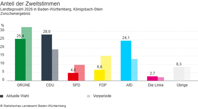 Bei den Zweitstimmen liegt in Königsbach-Stein ebenfalls die CDU vorne. Sie kam auf 1.559 Stimmen und damit 28,0 Prozent. Dahinter folgen die Grünen mit 1.416 Stimmen (25,4 Prozent). Die AfD erhielt 1.346 Stimmen (24,1 Prozent). Für die FDP wurden 368 Stimmen (6,6 Prozent) gezählt. Die SPD kam auf 270 Stimmen (4,8 Prozent), während Die Linke 153 Stimmen und damit 2,7 Prozent erreichte.