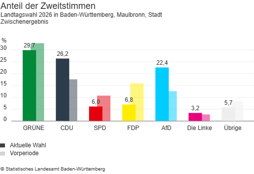 Bei den Zweitstimmen liegen in Maulbronn die Grünen vorne. Sie erhielten 973 Stimmen und damit 29,7 Prozent. Dahinter folgt die CDU mit 856 Stimmen (26,2 Prozent). Die AfD kam auf 733 Stimmen (22,4 Prozent). Für die FDP wurden 221 Stimmen (6,8 Prozent) gezählt. Die SPD erhielt 198 Stimmen (6,0 Prozent), während Die Linke 106 Stimmen und damit 3,2 Prozent erreichte.