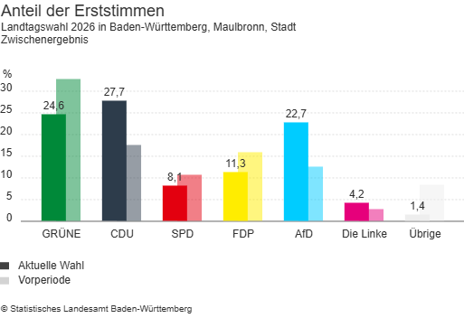 Maulbronn. Bei der Landtagswahl in Baden-Württemberg am 8. März 2026 hat in der Stadt Maulbronn bei den Erststimmen der CDU-Kandidat Nico Gunzelmann das beste Ergebnis erzielt. Er erhielt 903 Stimmen, was einem Anteil von 27,7 Prozent entspricht. Auf Platz zwei folgt Stefanie Seemann von den Grünen mit 802 Stimmen (24,6 Prozent). Dahinter liegt Alexander Steblau von der AfD, der 741 Stimmen und damit 22,7 Prozent der Erststimmen erreichte.