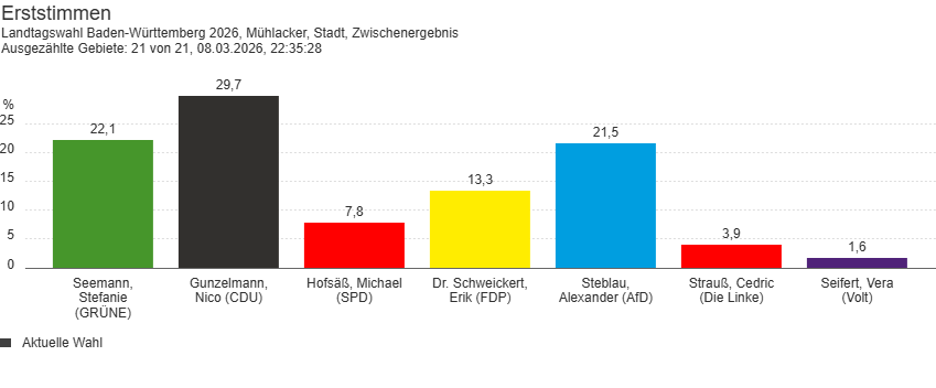 Mühlacker. Bei der Landtagswahl in der Stadt Mühlacker liegt bei den Erststimmen der CDU-Kandidat Nico Gunzelmann vorne. Er erhält 3.184 Stimmen (29,7 Prozent). Dahinter folgt Stefanie Seemann (Grüne) mit 2.373 Stimmen (22,1 Prozent). Alexander Steblau (AfD) kommt auf 2.312 Stimmen (21,5 Prozent).