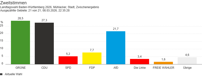 Bei den Zweitstimmen liegen die Grünen vorne mit 3.071 Stimmen (28,5 Prozent). Es folgen die CDU mit 2.934 Stimmen (27,3 Prozent) und die AfD mit 2.334 Stimmen (21,7 Prozent). Dahinter liegen FDP mit 826 Stimmen (7,7 Prozent), SPD mit 562 Stimmen (5,2 Prozent) und Die Linke mit 368 Stimmen (3,4 Prozent).