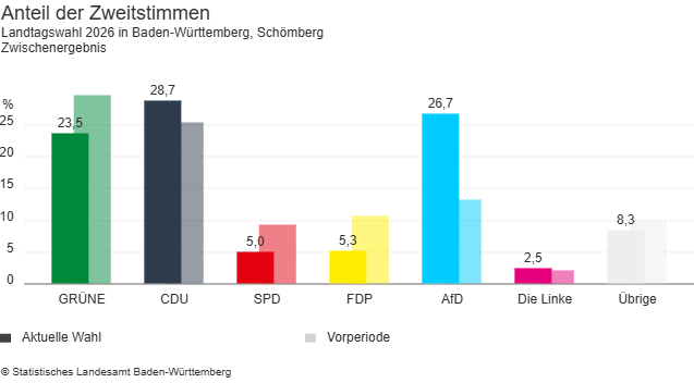 Schömberg. Bei der Landtagswahl in der Gemeinde Schömberg liegt bei den Erststimmen der CDU-Kandidat Carl Christian Hirsch vorne. Er erhält 1.307 Stimmen (35,7 Prozent). Dahinter folgt Miguel Klauß (AfD) mit 983 Stimmen (26,9 Prozent). Fynn Rubehn (Grüne) kommt auf 627 Stimmen (17,1 Prozent).
