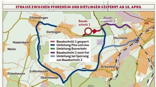 Nicht betroffen von dieser Umleitung während des ersten Bauabschnitts ist der Linienbusverkehr. Dafür wird laut Darstellung des Regierungspräsidiums (RP) Karlsruhe in Absprache mit den Gemeinden Keltern und Birkenfeld die Alte Dietlinger Straße genutzt. Diese Trasse führt am Ortsausgang Dietlingen zwischen dem Reihelberg und dem Gewerbegebiet Dammfeld vorbei auf die Kreisstraße 4538. Diese Vorgehensweise erzwingt aufwendige Vorarbeiten. Mehr lesen Sie am Mittwoch in der „Pforzheimer Zeitung“ oder im E-Paper auf PZ-news oder über die Apps auf iPhone/iPad und Android-Smartphones/Tablet-PCs.