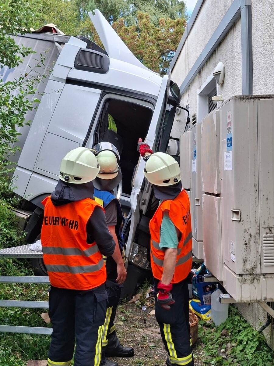 Nach bisherigem Sachstand sei der 61-Jährige gegen 10.15 Uhr mit seinem Sattelzug auf der Kreisstraße unterwegs gewesen, als er im Bereich Otto-Göhner-Straße/Altburger Straße von der Fahrbahn abkam. Im Anschluss sei der Sattelzug eine Böschung heruntergerutscht. Daraufhin sei der Lastwagen auf ein unbewohntes Gebäude gefahren und zum stehen gekommen.