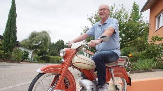 Königsbach-Stein. Roter Lack, stilvolle Weißwandreifen und viel Platz auf der gepolsterten Sitzbank: Die DKW Hummel super Typ 126 erinnert an eine Zeit, in der es noch kein Internet gab, keine Smartphones und im Fernsehen nur drei Programme. 1961 wurde das legendäre Moped gebaut. Rudolf Herdt aus Stein besitzt eines und hat es 2015 liebevoll restauriert, hat ihm unter anderem neue Felgen, Reifen und Auspuff verpasst, hat es frisch eingespeicht und lackiert. „Die läuft einwandfrei“, sagt Herdt: „Ich bin erst damit gefahren.“