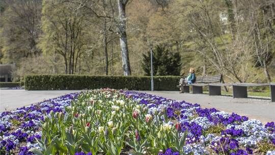 Zur Zeit Erfreuen farbenprächtige Pflanzinseln mit Stiefmütterchen und Frühjahrsblühern die Spaziergänger am Kurparkeingang, die Wiesenhänge sind mit gelben Narzissen übersät.