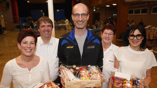 Simone Günther, Hubert Harr und Carmen Kauselmann (vorne, von links) erhalten ein Geschenk von den Kämpfelbacher Maltesern, vertreten durch Mathias Krumm und Martina Theurer. N. Roller