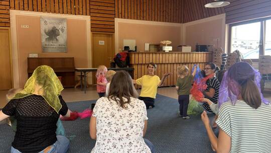 Neuhausen. „Das Fli-Fla-Flugzeug startet gleich, es fängt schon an zu beben“, singt die Musikpädagogin Ulrike Görres. Vierzehn Hände greifen nach einem Schwungtuch und bewegen es rhythmisch im Takt. Die Kinder können es kaum erwarten und dürfen „einsteigen“. „Und einmal hoch und einmal tief“ im inszenierten Gefährt mitfliegen. „Rasselkäfer“ heißt die Eltern- Kind-Gruppe von den Jüngsten aus Neuhausen und Umgebung. Mitmachen darf, wer zwischen einem und zwei Jahre alt ist. Auf die „Rasselkäfer“ folgen die Altersgruppen der „Musikwichtel“, „Musikriesen“, „Klangmäuse“ und „Notenpurzler“.