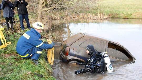 Ermittlungen gegen den Halter des Autos mit diesem Kennzeichen liefen bereits schon länger, doch das eigentliche Beweisstück – das Auto – war nicht auffindbar. Über das Motiv des Fahrzeughalters, sein Auto im See zu versenken, gibt es noch keine Aussagen von der Polizei. Sollte sich herausstellen, dass es sich dabei um den Mülltonnen-Crasher handelt, dürfte der sich nun wegen eines gefährlichen Eingriffs in den Straßenverkehr und wegen Unfallflucht verantworten müssen. Hinzu kommt dann noch ein Verstoß gegen das Umweltrecht, denn einen Opel Corsa mutwillig in einem Fischteich zu entsorgen, ist kein Müllsünder-Kavaliersdelikt.