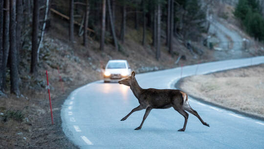 Zeigen sich Tiere, können Abblenden, Hupen und Bremsen einen Zusammenstoß verhindern. Im Ernstfall eine Vollbremsung machen, aber nicht ausweichen. Denn das kann im Gegenverkehr oder an einem Baum schlimmstenfalls tödlich enden.
