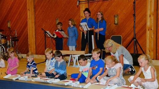Und das konnte sich hören und sehen lassen, was der große Beifall nach den einzelnen Auftritten bestätigte und außerdem zum Konzertausklang noch mehrere Zugaben herausforderte. Sascha Widmann führte durch das Programm. Er erinnerte daran, dass das Jugendorchester über Pfingsten zur Partnergemeinde San Polo d’Enza in der Emilia Romagna gereist war und dort mehrere Auftritte in Altersheimen und Dorffesten rund um San Polo hatte. Jetzt, beim Jugendkonzert in Eisingen, hatten die Jüngsten den Vortritt. Na, was wird denn das auf der Bühne? Die Kinder der musikalischen Früherziehung schleppten Bretter, Balken, einen Sägebock, Röhren, Hämmer und Folien rauf zur Bühne. „Kapo“ Ingrid Löffler, die Leiterin der Gruppe, lüftete das Geheimnis: Die neun Mädchen und Buben am Glockenspiel, die Melodika, die Blockflöte sowie die beiden Jugendmusikerinnen mit Querflöte machten bei einem gelungenen Auftritt die Handwerker musikalisch zum Thema. Dabei bot das Kinderlied „Wer will fleißige Handwerker seh’n, der muss zu uns Kindern gehen“ den idealen Background.