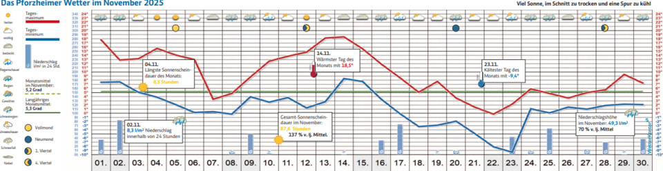 Im Tagesverlauf besserte sich dann die Entwicklung. Temperaturen um die null Grad mit nassem und regnerischem Wetter führten überdies zu so mancher Sorge vor Blitzeisbildung auf den Straßen und Gehwegen. Die Gesamtsonnenscheindauer im November lag bei gerade einmal 87,6 Stunden in Pforzheim und der Region. Im langjährigen Jahresmittel wird indessen ein Wert von 137 Prozent erreicht. Den meisten Niederschlag gab es am 2. und 17. November. Tatsächlich gab es aber auch viele trockene Tage, wobei die Regenhäufigkeit im letzten Monatsdrittel laut den Wetterfröschen besonders hoch war.