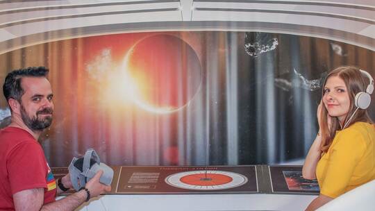 Der Weltraum, unendliche Weiten eröffnen sich vor dem Schaltpult des Raumschiffs. Dann eine helle Fläche unter uns, übersät mit Blasen und Kratern. Staub wirbelt auf, die ersten Schritte, eher kleine Hüpfer – wir sind auf dem Mond gelandet. Also Neil Armstrong und ich mit meiner VR-Brille. Bevor die virtuelle Welt wieder der Realen weichen muss, erzeuge ich mit dem elektronischen Musikinstrument Theremin ohne es berühren zu müssen ein paar sphärische Klänge und schwelge auf meinem Kommando-Sessel mit Blick auf das am Computer gezeichnete und dann ausgedruckte halbrunde, Acht-Meter-Weltraumpanorama in den Klängen von „Major Tom“. Die Musik ist ein wenig zu laut eingestellt wie Museumsleiterin Jacqueline Maltzahn-Redling bemerkt. Das muss bis zur Eröffnung der neuen Schau „Phänomen Universum. Utopie und Wirklichkeit“ noch leiser gestellt werden. Die Ausstellungsmacher im Schloss in Neuenbürg sind in den letzten Zügen.