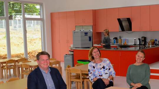 Dies geschieht zwar nun unter Corona-Bedingungen mit entsprechendem Hygienekonzept als eine Teilöffnung mit 50 Ü-3-Kindern im Erdgeschoss und zehn U-3-Kindern im Obergeschoss. Im späteren Vollbetrieb können 110 Kinder betreut werden, vier Ü-3-Gruppen und zwei U-3-Gruppen.