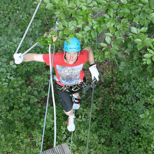 Illingen-Schützingen. Das Sturmtief „Sabine“ hat im Februar große Schäden in der Region angerichtet – auch im Kletterwald Illingen. Das Unwetter hat den Baum der beliebten Basejump-Station zu Fall gebracht. Seither fehlte das zwölf Meter hohe Kletterelement im Parcours, von dem man sich gesichert hat fallenlassen können. Seit Samstag dürfen sich die Besucher nun aber endlich wieder über den besonders hohen Nervenkitzel freuen. Denn das Team des Kletterwalds bemühte sich seit dem Fall des Baumes um einen Ersatz, der nun zum Einsatz kommt. Die Installation des Basejump an einer großen Eiche im Gelände wurden nun beendet. Den Sprung aus zwölf Metern Höhe in Illingen wollte sich auch Susan Köhler am Wochenende nicht entgehen lassen.