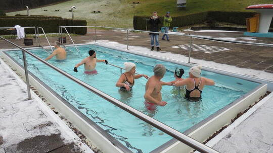 Als eine der Ersten hat Britta Ehrke ein kühles Bad genommen. Bei einer Wassertemperatur von 5 Grad Celsius im Massagebecken (1,25 Meter Tiefe) verbrachte die Vorsitzende des