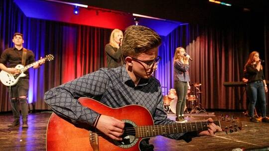 „Mir geht die Luft aus“, klagten augenzwinkernd die Schüler der Grundschul-Bläserklasse, die den Abend musikalisch eröffnen sollten. Gut dass Lehrer Reinhard Müller eine Luftpumpe dabei hatte. Damit konnten die Viertklässler mit „Oh Susanna“ und dem „Penguin March“ doch noch den Abend starten. Überraschend anders der folgende Auftritt. Die Klasse 5b präsentierte sich als „Orchester on air“. So brachte Lehrer Simon Hartmann nicht etwa „Luftgitarristen“ sonder gleich ein ganzes klassisches Orchester mit imaginären Instrumenten auf die Bühne, das er humorvoll anleitete. Der Popchor unter der Leitung von Lehrerin Anja Bruckner brachte die erste Interpretation des Hits „99 Luftballons“ auf die Bühne. Auch die Trommel-AG von Ulli Baral ließ den Hit von Nena erklingen. Die Siebtklässlerinnen Kaya und Kim Friede nahmen sich des Lieds auf Rollschuhen tanzend an.