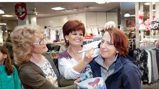 Weitere Werke von ihm gab es in der Hauptstraße zu sehen. Die Musiker der Gruppe Yannick Monot und Les Moutons Menteurs haben nicht nur die Einweihung des Kunstwerkes begleitet, sie spielten im Laufe des Abends auch vor verschiedenen Geschäften auf. Die Schüler der Musikschule Fauth zeigten ihr Können vor der Musikschule. Bei Edeka spielte Waldemar Juhl auf. Auch der Musikverein Niefern mischte mit wechselnden Auftrittsorten mit. So konnte es schon vorkommen, dass man sich im Bekleidungshaus Wolf von Kosmetikerin Martina Kusterer schminken ließ, während die Musiker draußen „Rote Lippen soll man küssen“ spielten.