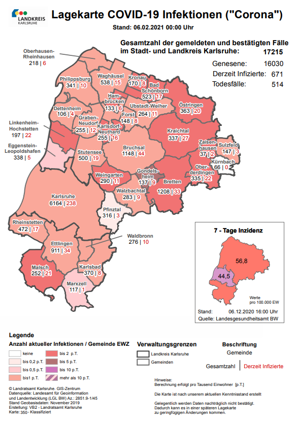 Als noch infiziert gelten in der Fächerstadt und den umliegenden Gemeinden derzeit 671 Menschen, 16.030 sind indes wieder genesen. Die 7-Tage-Inzidenz im Stadtgebiet beträgt laut LGA 46,1, im Kreis liegt der Wert bei 58,4 (Stand: 6. Februar).