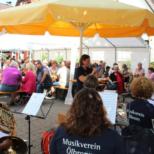 Mit Blasmusik hockt es sich gut vor dem Rathaus: Fest des Ölbronner Musikvereins