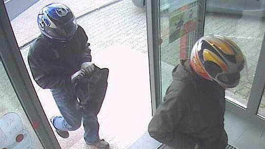Einer der Täter ist etwa 1,70 Meter groß und schlank. Er war mit einem olivgrünen Parka mit Kapuze und Jeans bekleidet. Der von ihm getragene Motorradhelm ist in der Grundfarbe gelb-orange und hat schwarze Applikationen.