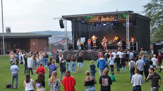 „Wir haben mega Bock, mit euch eine Party zu feiern – holt alles raus, was ihr anderthalb Jahre lang versteckt habt und geht richtig ab“, begrüßte Moderatorin Justine Leonhardt zusammen mit Jack Schickle die rund 150 Zuschauer von der großen Festivalbühne. Derweil heizte die heimische Band Bandwurm um die Brüder Felix (Keyboard), Tim (Schlagzeug), Max (Gesang) und Hannes Zilly (Bass) und ihre musikalischen Freunde Isabel Walther (Gesang), Christian Fieß und Ramino Bolz (Gitarre) die Stimmung kräftig ein. Mit bekannten und einigen selbst geschriebenen Lobpreisliedern sorgten sie für eine gefühlsvolle Stimmung zum Sonnenuntergang – samt heiterem Neue Deutsche Welle-Medley als Zugabe.