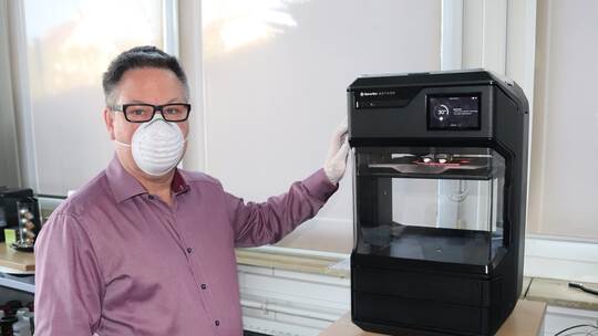 Marcus Beisteiner und seine zwei 3D-Drucker – die im EAZ eigentlich zu Lernzwecken dienen – gehören einem bundesweiten Netzwerk namens „Maker versus Virus“ (zu deutsch: „Macher gegen das Virus“) an, das sich erst vor wenigen Wochen