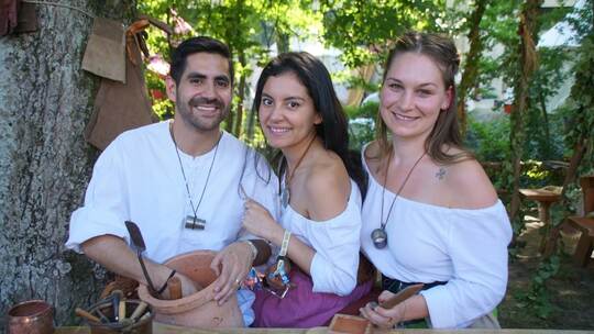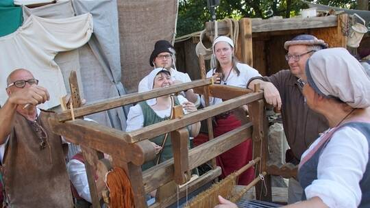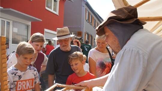 Darauf achtet auch Natascha Kroll, die in ihrem Spinnrad gekämmte Schafswolle zu einem dünnen Faden verzwirbelt. Julia Wurst schaut ihr dabei zu. Ein paar Meter weiter lassen sich der zehnjährige Marlon und sein zwölfjähriger Bruder Silas von Frank Blase zeigen, wie mühsam man früher Papier hergestellt hat. Die beiden sind mit ihrer Oma Ingrid Frech aus Spaichingen hergekommen. „Man kann hier tolle Spiele machen“, sagt Marlon, „und viel über das Mittelalter lernen“. Apropos Lernen: Auf der gegenüberliegenden Straßenseite ist Gabi Stegmaier gerade dabei, ein fest auf einer Pechkugel eingebettetes Kupferblech mit Hilfe eines Ziselierhammers und verschiedener Punzen zu verzieren. Später soll daraus eine Gürtelschnalle werden. „Wir haben lange recherchiert, bis wir genau wussten, wie man das im Mittelalter gemacht hat.“ Am Seedamm wird unterdessen gekocht. Carmen, Hannah, Martina, Angie, Judith, Anna und Pia von den Neibsheimer Armbrustschützen sitzen an einer langen Tafel und schneiden Karotten und Zwiebeln. Mit Graupen vermischt, soll daraus ein Eintopf werden – die Beilage zu dem Krustenbraten, der schon seit einer Weile im Ofen gart.
