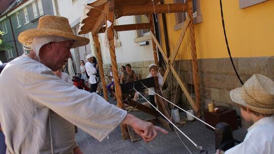 Steve und Navonna haben eine noch längere Anreise hinter sich: Sie kommen aus England und gehören zur „Free Group“, die schon seit 22 Jahren nach Bretten kommt. Normalerweise kämpfen die edlen Rittersleute tapfer gegen ihre Feinde. „Aber jetzt haben wir frei und schauen uns ein bisschen um“, sagt Steve. Zu entdecken gibt es schließlich genug. Das stellen auch Oskar (5) und Mathis (7) fest. Aus zwölf Fäden stellen die beiden Brüder unter Joachim Dittus Anleitung zwei stabile Baumwollstricke her. Dittus ist Seiler und erklärt, früher habe man solche Stricke unter anderem zum Anleinen von Tieren und zum Binden von Gerüsten benutzt. „Heute kann man damit auch toll Seilhüpfen.“