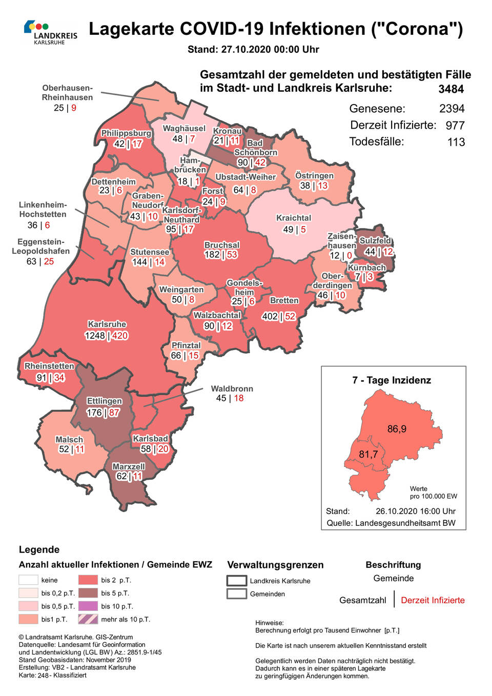 Die Zahlen für den Stadt- und Landkreis Karlsruhe zeigen an, dass es hier drei neue Corona-Todesfälle gab. Insgesamt sind es nun 113, von denen rund ein Drittel auf die Todesfälle in einem Altenheim in Bretten-Neibsheim zurückgehen. Bei insgesamt 3484 Corona-Fällen (plus 95 am Dienstag) und 2394 Genesenen (plus 45) sowie 113 Todesfällen (plus drei) ergeben sich 977 Akut-Fälle. Die Corona-Liste von Stadt- und Landkreis Karlsruhe gibt folgende Inzidenzwerte an: Die Stadt Karlsruhe hat 81,7 Neuinfizierte pro 100.000 Einwohnern in den vergangenen sieben Tagen, der Landkreis kommt auf 86,9. In der LGA-Liste hat die Stadt einen Inzidenzwert von 87,5 und der Landkreis von 85,8.