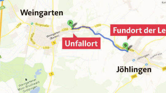 Um 7.24 Uhr meldete ein Anwohner der Jöhlinger Straße in Weingarten über Notruf einen Verkehrsunfall, wobei ein Verursacher nicht mehr vor Ort war. Am Unfallort standen nur vier beschädigte Fahrzeuge und etliche Trümmerteile lagen auf der Fahrbahn. Um 7.45 Uhr meldete sich ein 34-jähriger Mann aus Jöhlingen und teilte ebenfalls über Notruf mit, dass er wohl in Weingarten einen Verkehrsunfall verursacht hätte, aber dann weitergefahren sei. Um 8.10 Uhr ging über Notruf ein weiterer Anruf ein, bei dem zwei Jogger eine tote Person im Bereich der Weingartener Straße in Jöhlingen auf der Straße liegend meldeten.