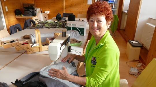 Häswart Karin Fuchs (oben) näht die Stoffstreifen an die Hose, die Zunftmeister Johannes Gall (oben rechts) vorbereitet hat. Der stellvertretende Zunftmeister Stefan Schoch (rechts) schneidet die Fransen ein.