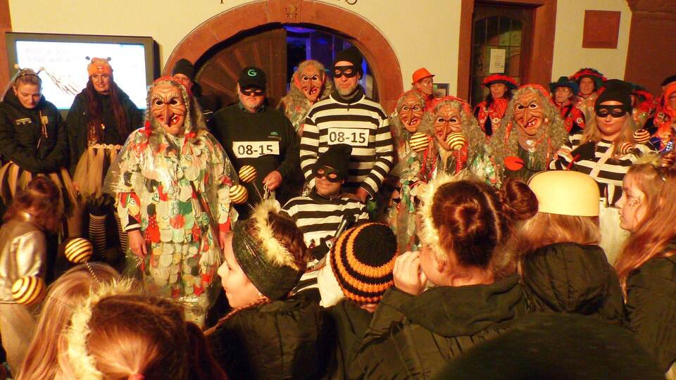 Was in Faschingshochburgen am „Schmotziga Dunnerstig“ längst Tradition ist, feierte am Nachmittag in Neulingen eine Premiere mit einem Rathaussturm durch die Waldhexen aus Nußbaum und Buckelhexen aus Neulingen und Umgebung. Diese haben Bürgermeister Michael Schmidt (Dritter von links) überfallen, verhaftet und "entmachtet", wobei er vor dem Verwaltungszentrum Bauschlott im Beisein vieler Schaulustiger symbolisch den Rathausschlüssel bis Aschermittwoch abgeben musste. - Peter Dietrich