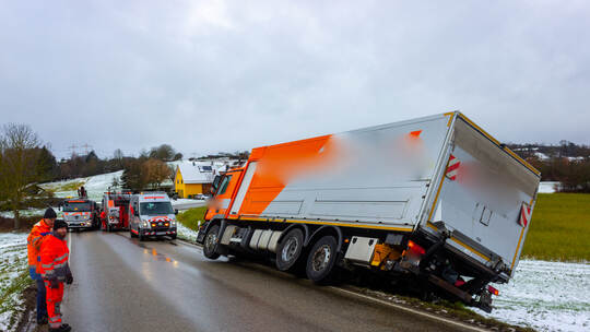 Der Lkw fuhr neben der Fahrbahn in das weiche Erdreich und bleib dort in gefährlicher Schräglage stecken. Der zur Seite gekippte Lkw drohte ins Feld zu stürzen. Verletzt wurde niemand bei dem Unfall.