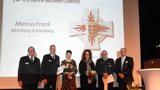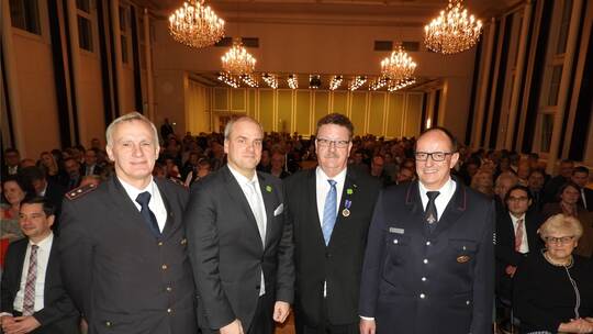 Beim Neujahrsempfang (von links): Rainer Zillinger, Kommandant der Feuerwehr Schömberg, Marcus Frank mit Gattin, Hubert Maisenbacher mit Gattin (links neben ihm) sowie Bürgermeister Matthias Leyn.