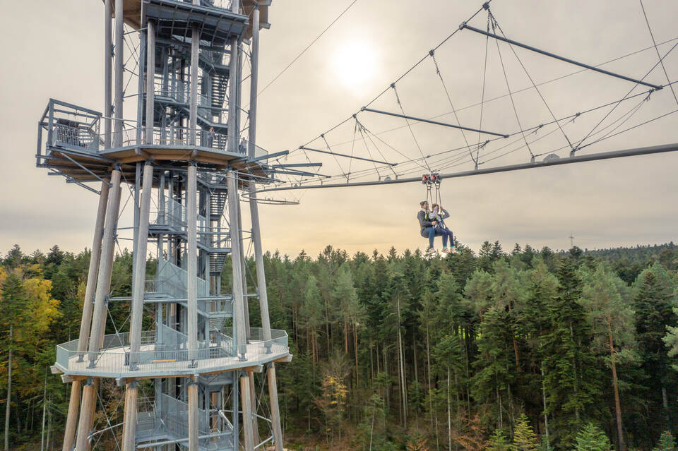 Mit der Black Forest Flyline bietet der Waldflug Schömberg ein Abenteuer für alle, die Lust auf Natur, Freiheit und ein sanftes Fluggefühl haben. Hoch über den Baumwipfeln, mit einer Strecke von 500 Meter gleitet man nahezu lautlos durch die Wipfel – und erreicht dabei Geschwindigkeiten von bis zu zwölf Stundenkilometern. Höhenangst sollte man allerdings keine haben: Denn aus 35 Metern Höhe beginnt der Flug, der sich dann rund dreieinhalb Minuten zieht.