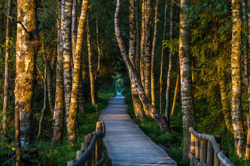 Was sie so besonders macht: Hochmoore werden ausschließlich durch Niederschlagswasser gespeist. Die Nährstoffarmut macht sie zu einem einzigartigen Lebensraum für hochspezialisierte Tier- und Pflanzenarten – darunter seltene Libellenarten und verschiedene Moose. Besonders bedeutsam ist das Hochmoor zudem als Rückzugsraum für das Auerhuhn, eine Symbolart des Schwarzwalds. Gleichzeitig sind die Moore Orte der Ruhe und Erholung für Menschen. Holzstege führen durch die weite, stille Landschaft. Wer sie betritt, spürt sofort die Magie dieses uralten Naturraums – und die wohltuende Wirkung auf Körper und Geist. Das Infozentrum Kaltenbronn bietet in der Ausstellung „Die Natur am Kaltenbronn“ und auf geführten Touren und Mitmachangeboten spannende Einblicke in diesen sensiblen Lebensraum. Große und kleine Besucher erfahren, wie Moore nicht nur Biodiversität sichern, sondern auch als natürliche Wasserspeicher und Klimaschützer wirken – denn sie binden große Mengen Kohlenstoffdioxid.