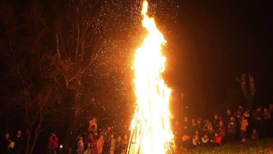 Königsbach-Stein. Je weiter sich das Feuer knisternd und knackend in dem kegelförmig angelegten Holzstapel ausbreitet, desto wärmer wird es in der Umgebung. Im Licht der meterhoch in den schwarzen Nachthimmel lodernden Flammen haben sich zahlreiche Menschen versammelt, viele mit ihren Kindern, für die am Wochenende auf dem Königsbacher Kirchberg auch sonst viel geboten war.