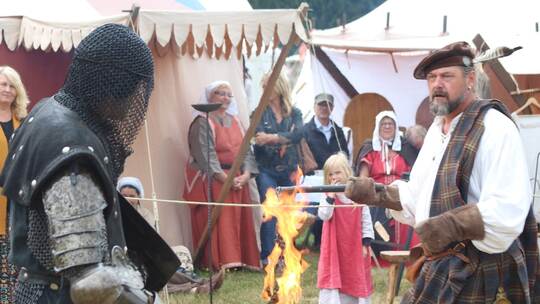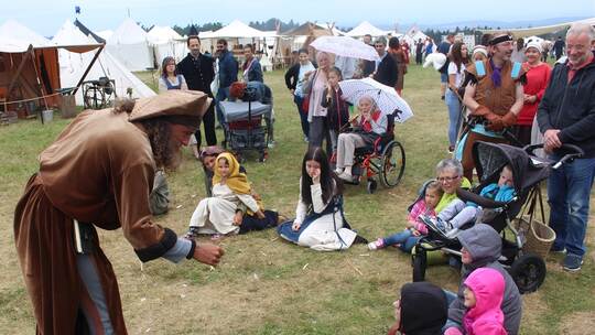Dobel. Jubel brandet auf. In letzter Sekunde entgeht Katrin dem Scheiterhaufen und ehelicht stattdessen einen tapferen Ritter. Dieser hatte sich bei den Ritterspielen der „Brachmanothen“ mit tollkühnen Einlagen gegen die anderen Rittersleute durchgesetzt. Solche und zahlreiche andere Szenen konnten die Besucher beim achten Spectaculum auf dem Dobel beobachten. Von Freitag bis Sonntag verwandelte sich das Gelände rund um den Wasserturm in ein Mittelalterdorf.