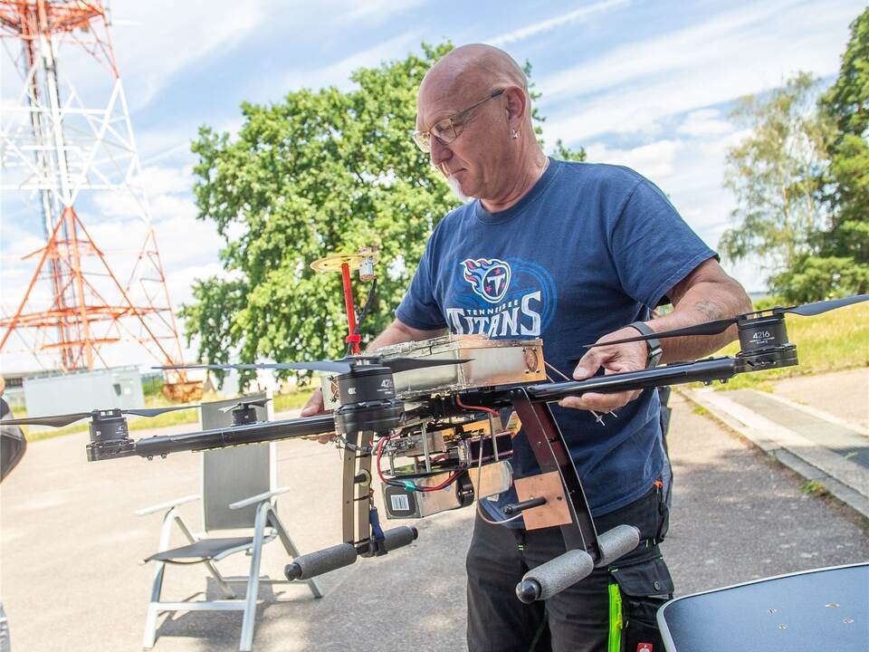 „Bei den Versorgungsmessungen handelt es sich um eine turnusmäßige Überprüfung“, erklärt Sender-Techniker Fegert. „Das ist jedes mal ein großes Spektakel.“ Früher habe man solche Maßnahmen nur mithilfe von viel Personal und unter Einsatz eines Hubschraubers bewerkstelligen können. „Das ist heute also wesentlich einfacher, aber immer noch äußerst sehenswert“, sagt Fegert. Schließlich bekomme man Flugdrohnen in diesem Ausmaß nicht gerade häufig zu Gesicht.