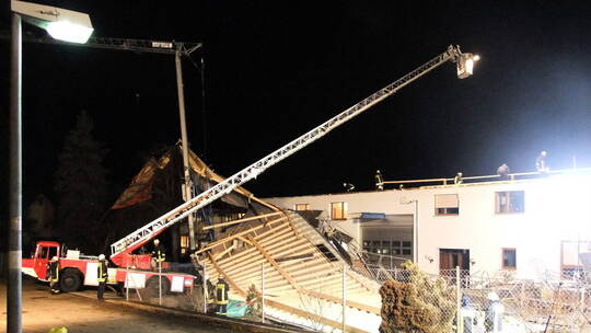 Den Einsatzkräften bot sich vor Ort laut Einsatzbericht ein Bild, „Das man eigentlich seither nur aus dem fernsehen gekannt hatte.“ Vor Ort musste ein Notdach erstellt werden, um die Bausubstanz vor zu erwartendem Regen zu schützen. Zusätzlich wurden auch im Gebäude im oberen Stockwerk Büroausstattungen und Möbel durch Folie abgedeckt, damit eventuell auftretende Folgeschäden vermieden werden konnten. Der Baustellenkran wurde mit einem Holzbalken abgestützt. Die Arbeiten zogen sich bis etwa 1 Uhr hin. Die Feuerwehr war mit 5 Fahrzeugen und 17 Einsatzkräften vor Ort.