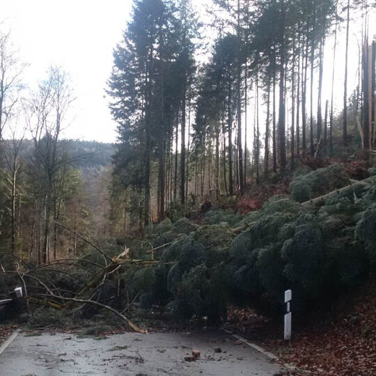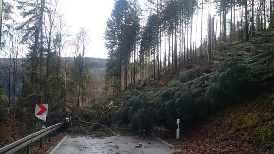 Da die Aufräum- und Holzarbeiten umfangreicher sind als zunächst vermutet, hat sich die Wiederöffnung der Kreisstraße verschoben. Die Freigabe für den Verkehr ist nun für den 21. März vorgesehen. Die ausgeschilderte Umleitung führt über den Dreimarkstein und Dennach.