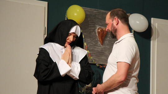 Oliver Schnitzlein spielte mitleiderregend den total verwirrten Arzt David, der nach seinem Junggesellenabschied einen sogenannten „Hangover“ hatte und sich nicht mehr daran erinnern konnte, eine ihm völlig Fremde geheiratet zu haben. Jan, der hilfreiche Freund, trefflich durch Stefan Springer in Szene gesetzt, bemühte sich, vor der eigentlichen Verlobten und der Familie die Sache zu
