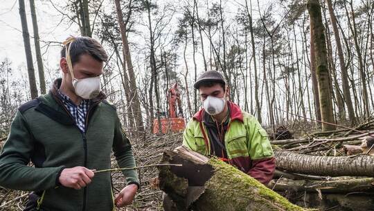 Damit sie nicht auf Wanderer stürzen, müssen befallene Exemplare aus Sicherheitsgründen gefällt werden. Überdies kann der Pilz heftige allergische Reaktionen auslösen, wenn man seine Sporen einatmet. Forstmitarbeiter nähern sich betroffenen Bäumen daher nur mit Atemschutz. Das Fällen wird in der Regel nicht per Hand, sondern aus sicherer Entfernung mit einem Harvester vorgenommen. Die Redaktion sprach mit dem Pressesprecher des Enzkreis-Forstamts, Dominik Saladin.