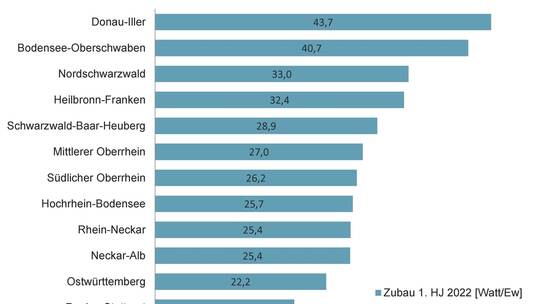 Das Land peilt einen Zubau von 2200 Megawatt jährlich an. Im ersten Halbjahr 2022 lag der Photovoltaikzubau in Baden-Württemberg bei rund 382 Megawatt installierter Leistung. Im Vergleich zum Vorjahr wird ein höherer Zubau erwartet, 2021 wuchs der Bestand um insgesamt 620 Megawatt.