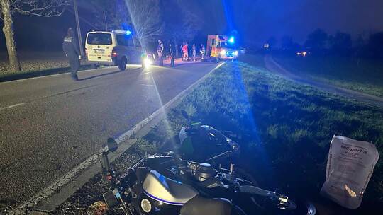 Ein zweiter Motorradfahrer hinter dem Auto habe das wohl zu spät erkannt, so ein Sprecher der Polizei, und ist dem Auto aufgefahren. Ein dritter Motorradfahrer sei daraufhin gestürzt. Eines der am Unfall beteiligten Motorräder sei dann auf den ersten Motorradfahrer gerutscht, der bereits auf dem Feldweg stand.